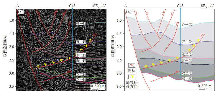 渐新世晚期,伊通盆地在引张应力场作用下发育大型伸展正断层,并作为油气运移通道连接油气源和圈闭,当断层垂向开启时,油气便可顺着油气运移通道自高势区向低势区运移。以岔路河断陷西北缘典型油气藏C43剖面为例,利用平衡剖面恢复研究区成藏期古构造形态,得到成藏期埋藏深度,计算出此时C43油气藏断面正压力为13.1 MPa,小于断层垂向封闭临界压力值(13.3 MPa),说明C43油气藏附近控藏断层在成藏期表现为垂向开启,与油气大量生排烃时期相吻合,有利于双阳组烃源岩生成的油气沿着开启的控藏断层向上运移至双二段和浅层,具有沟通油源、运移油气的作用(图 8)。