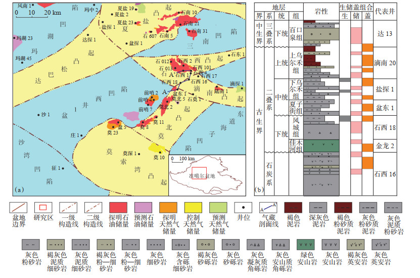 盆1井西凹陷自下而上发育石炭系、二叠系、三叠系、侏罗系、白垩系、古近系、新近系和第四系地层。其中二叠系与三叠系、三叠系与侏罗系、侏罗系与白垩系之间均为不整合接触。石炭系—二叠系是海陆过渡相沉积,中—新生界则属于陆相沉积,本次研究主要针对盆1井西凹陷及周缘石炭系—二叠系展开。研究区石炭纪火山活动频繁,火山溢流作用与火山爆发作用交替出现,形成多套火山活动旋回,钻遇岩性以大套的火山岩为主(凝灰岩、安山岩及火山角砾岩等)。二叠系自下而上发育佳木河组(P1j)、风城组(P1f)、夏子街组(P2x)、下乌尔禾组(P2w)和上乌尔禾组(P3w),主要发育退覆式扇三角洲沉积体系,整体发育水进退积沉积旋回。佳木河组岩性主要为绿色安山岩和灰绿色砂岩;风城组岩性主要为云质泥岩、云质砂岩与砂砾岩等;夏子街组岩性主要为砂砾岩、泥质砂岩和砂质泥岩互层;下乌尔禾组主要发育泥岩、粉砂岩与砂砾岩;上乌尔禾组顶部为棕褐色泥岩,中下部为灰色砂砾岩、粉砂岩。盆1井西凹陷深层发育二叠系风城组、下乌尔禾组2套烃源岩和火山岩、砂砾岩及云质岩3种岩性,储层物性好,厚度大,具备规模勘探的条件[9]。受海西期南北向和东西向2组大型断裂控制,在凹陷周缘凸起区石炭系发育多个有利鼻凸构造带,鼻凸构造带间为洼槽区。二叠纪—三叠纪陆梁隆起持续隆升,遭受风化剥蚀,为盆1井西凹陷提供物源,低部位洼陷区发育二叠系、三叠系地层,并向北部凸起区依次超覆尖灭,形成大型地层圈闭背景,2类规模勘探领域形成互补之势(图 1b)。