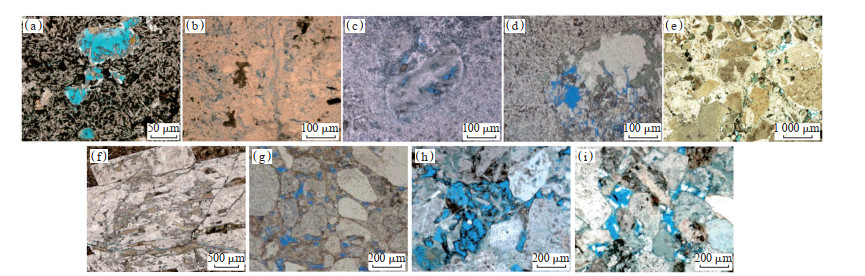 下载原图 图 10 准噶尔盆地盆1井西凹陷石炭系—二叠系深层储层镜下特征 (a)安山岩,原生气孔与次生溶孔伴生,石西4井,4 720.80 m,石炭系,铸体薄片,单偏光;(b)安山岩,基质溶孔,石西4井,4 589.79 m,石炭系,铸体薄片,单偏光;(c)安山岩,斑晶溶孔,石003井,4 320.40 m,石炭系,铸体薄片,单偏光;(d)火山角砾岩,角砾溶孔,石西16井,4 814.00 m,石炭系,铸体薄片,单偏光;(e)火山角砾岩,粒间溶孔与斑晶溶孔,石西3井,4 720.59 m,石炭系,铸体薄片,单偏光;(f)火山角砾岩,矿物炸裂缝,石西16井,4 808.90 m,石炭系,铸体薄片,单偏光;(g)砂砾岩,粒间溶孔,石西18井,5 005.30 m,二叠系风城组,铸体薄片,单偏光;(h)砾质砂岩,粒内溶孔,石莫1井,4 753.70 m,二叠系上乌尔禾组,铸体薄片,单偏光;(i)砂砾岩,粒间溶孔,盆东1井,5 131.12 m,二叠系夏子街组,铸体薄片,单偏光。 Fig. 10 Microscopic characteristics of deep Carboniferous-Permian reservoirs in western well Pen-1 sag, Junggar Basin |