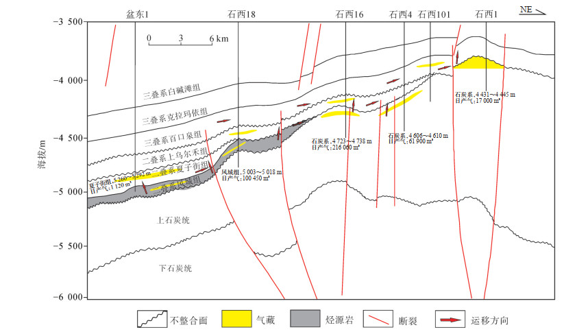 盆1井西凹陷石炭纪—二叠纪早期活跃的断裂- 火山活动奠定了凹陷周缘的构造格局,周缘凸起高部位缺失二叠纪—早三叠世沉积,但在凸起的低部位及其周边则形成了厚度差异较大的二叠纪—早三叠世沉积。受构造作用影响,研究区纵向上发育了石炭系与二叠系区域不整合面,受石炭系古凸起控制,二叠系地层逐层超覆沉积,在二叠系内部发育局部不整合面,在靠近古凸起区发育超覆不整合,向凹陷区逐渐变为平行不整合。不整合面长期经受风化淋滤、溶蚀作用可改善储层物性,渗透性砂体是深层天然气侧向运移的主要通道,与垂向的深部断裂组合共同构成了深层天然气成藏的输导体系(图 11)。