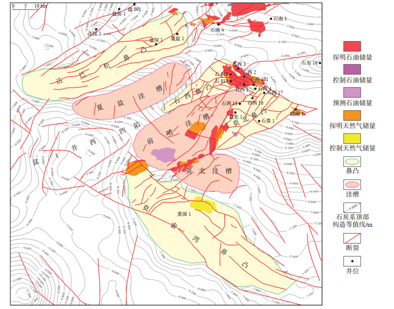 4.1 石炭系勘探领域盆1井西凹陷周缘石炭系发育大型构造及火山岩体,20世纪90年代初发现有石西油田,近年来石西16井、石西161-H井获高产油气流。气藏发育与凹陷周缘古凸起有关,石炭系发育有爆发相火山角砾岩及溢流相中酸性火山岩,近火山通道相角砾岩物性好,厚度大,具备规模勘探的条件。钻探进一步证实,古凸起带至生烃灶的距离与深层天然气成藏关系密切,源储大跨度断接是石炭系成藏的关键。受大型断裂控制,盆1井西凹陷周缘发育四大鼻凸构造带,倾末于凹陷区,深入烃源岩,二叠系烃源岩与鼻凸带石炭系通过断裂大跨度侧向对接。目前发现的油气富集在凸起带靠近凹陷区烃源岩一侧,石西鼻凸、莫北鼻凸处于盆1井西凹陷天然气运移有利指向区。上覆的二叠系厚层泥岩和石炭系内部溢流相致密层可形成良好的盖层,封盖能力强,保存条件好,有利于气藏的保存。