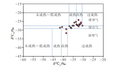 下载原图 图 2 准噶尔盆地盆1井西凹陷石炭系—二叠系深层天然气δ13C2与δ13C1交会图 Fig. 2 Cross plot of δ13C1 and δ13C2 of deep natural gas of Carboniferous-Permian in western well Pen-1 sag, Junggar Basin |