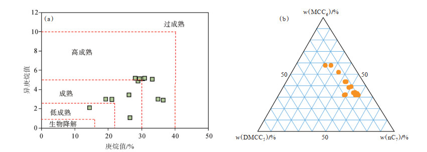 天然气C7轻烃化合物包括甲基环己烷(MCC6)、二甲基环戊烷(DMCC5)和正庚烷(nC7),三者的质量分数可以反映天然气母质类型[16]。在研究区石炭系—二叠系深层天然气的轻烃C7系列中,二甲基环戊烷的质量分数普遍较小,为9.89%~20.19%,平均值为13.37%;甲基环己烷的质量分数较大,为32.14%~58.37%,平均值为38.84%,正庚烷的质量分数变化较大,为25.37%~56.56%,平均值为47.79%。因此,天然气轻烃C7系列甲基环己烷的质量分数明显大于二甲基环戊烷,反映了研究区深层天然气以陆源母质类型为主,偏腐殖型。正庚烷的质量分数变化大,可能是受到天然气成熟度的影响(图 3b,表 2)。