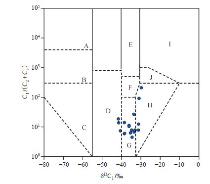 下载原图 图 4 准噶尔盆地盆1井西凹陷石炭系—二叠系深层天然气成因类型 A. 生物气;B. 生物气和亚生物气;C. 亚生物气;D. 原油伴生气;E. 油型裂解气;F. 油型裂解气和煤型气;G. 凝析油伴生气和煤型气;H. 煤型气;I. 无机气;J. 无机气和煤型气。 Fig. 4 Genetic types of deep natural gas of CarboniferousPermian in western well Pen-1 sag, Junggar Basin |