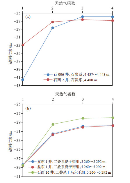 盆1井西凹陷石炭系—二叠系深层天然气以煤型气为主,见部分混源气,此外有少数天然气样品落在原油伴生区(D区),显示油型气特征(参见图 4),其碳同位素值明显小于下乌尔禾组,δ13C1小于-38.5‰,δ13C2小于-29‰,且碳同位素均未出现倒转,呈现正序列,与玛湖凹陷油型气特征相似(图 5b)。