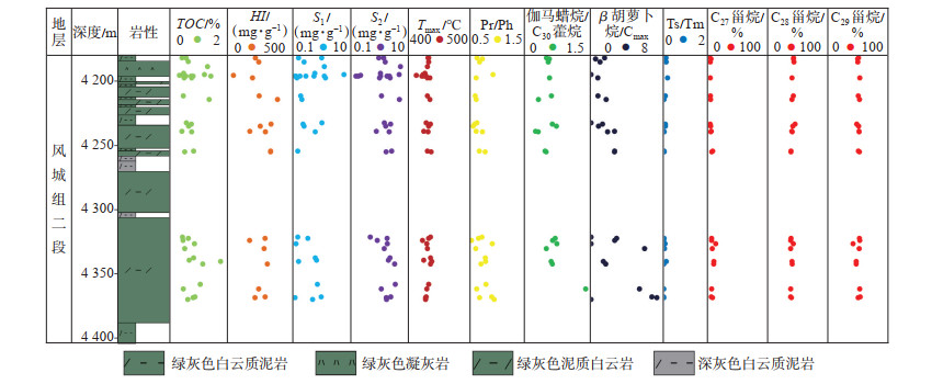 下载原图 图 6 准噶尔盆地玛湖凹陷风南1井二叠系风城组烃源岩地球化学特征 Fig. 6 Geochemical characteristic parameters of source rocks of Permian Fengcheng Formation in western well Pen-1 sag, Junggar Basin |