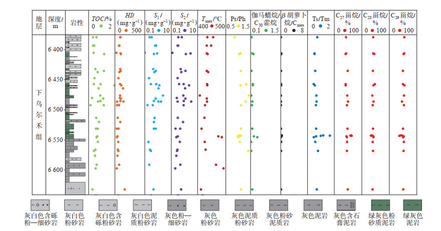 下载原图 图 7 准噶尔盆地莫索湾凸起莫深1井二叠系下乌尔禾组烃源岩地球化学特征综合柱状图 Fig. 7 Geochemical characteristic parameters of source rocks of Permian lower Urho Formation in western well Pen-1 sag, Junggar Basin |