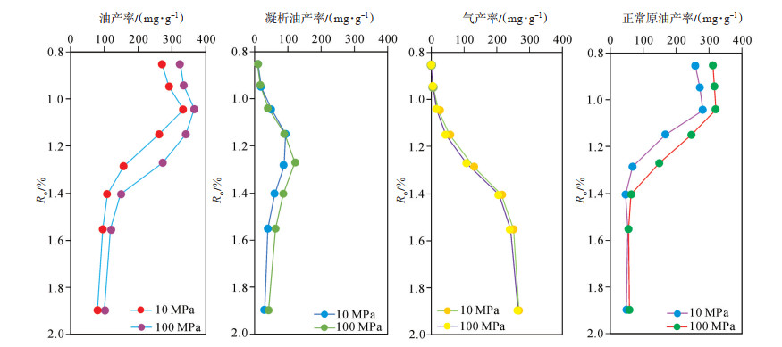 选取研究区烃源岩样品开展生烃热模拟实验,样品参数信息如表 3所列。烃源岩生烃热模拟实验结果表明:当Ro为1.05% 时,风城组烃源岩油产率达到高峰,峰值为333.25 mg/g(压力为10 MPa) 和364.43 mg/g(压力为100 MPa);Ro约为1.27% 时,凝析油(C6—C14)产率达到高峰,峰值为89.34 mg/g (压力为10 MPa)和122.00 mg/g(压力为100 MPa);Ro约为1.00%时,产气率(C1—C5)约为10 mL/g,达到好气源岩标准。当Ro约为1.41% 时,下乌尔禾组烃源岩凝析油(C6—C14)产率达到高峰,峰值为78.56 mg/g,凝析油(C6—C14)产率明显大于正常原油(C14+);当Ro约为1.40% 时,产气率约为10 mL/g,达到好气源岩标准(图 8、图 9)。