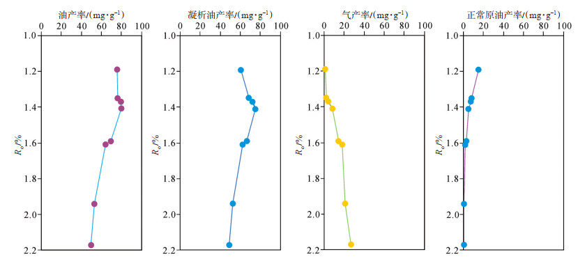 下载原图 图 8 准噶尔盆地玛湖凹陷风南1井二叠系风城组烃源岩生烃热模拟产烃曲线 Fig. 8 Simulated hydrocarbon generation curves of source rocks of Permian Fengcheng Formation in western well Pen-1 sag, Junggar Basin |