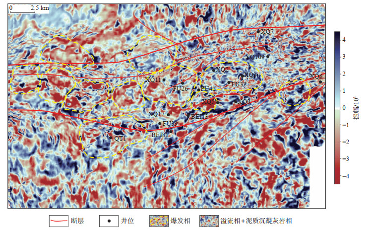在地震沉积学研究中,层切片技术则是用于地震相带研究的有力技术手段。层切片更接近于等时界面,可形象地反映地层产状,通过层切片提取的地层地震属性能一定程度上反映真实的地层属性。因此,层切片技术可以应用于研究相带的平面展布与演化规律,而松喀尔苏组a段爆发相丘状火山岩体在平面上往往具有同心圆或放射状的圆形特征,与其他岩相的反射特征明显不同,因此层切片属性能够较好地预测其岩相。从松喀尔苏组a段顶界向下100 ms层切片的振幅属性平面图看,爆发相外形基本表现为圆形或椭圆形特征,内部呈现环带状或放射状、弱连续反射结构(图 7)。受西泉鼻隆南北2条控凸断裂控制,爆发相主要在西泉鼻隆主体部位分布,处于油气运聚的有利指向区,成藏条件较为优越,因此鼻隆主体部位是松喀尔苏组a段爆发相岩体下一步勘探的重点区。FU26井区初步落实爆发相岩体11个,总面积为117 km2,前期仅QT1井钻揭松喀尔苏组a段爆发相岩体,因此该区勘探潜力较大。