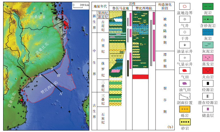 下载原图 图 1 赞比西坳陷和鲁伍马盆地位置(a)及岩性地层综合柱状图(b)(据IHS数据库修改) Fig. 1 Location (a) and stratigraphic column (b) of Zambezi Depression and Rovuma Basin |