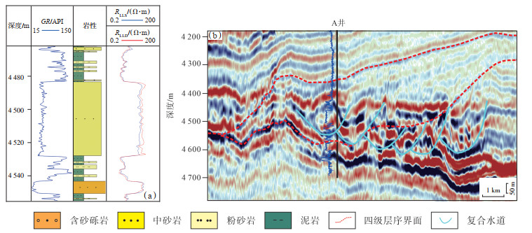 下载原图 图 2 鲁伍马盆地典型侧向迁移水道复合体测井响应特征(a)、地震响应特征(b) Fig. 2 Wire-line logging facies (a) and seismic facies (b) of typical lateral migrated channels in Rovuma Basin |
