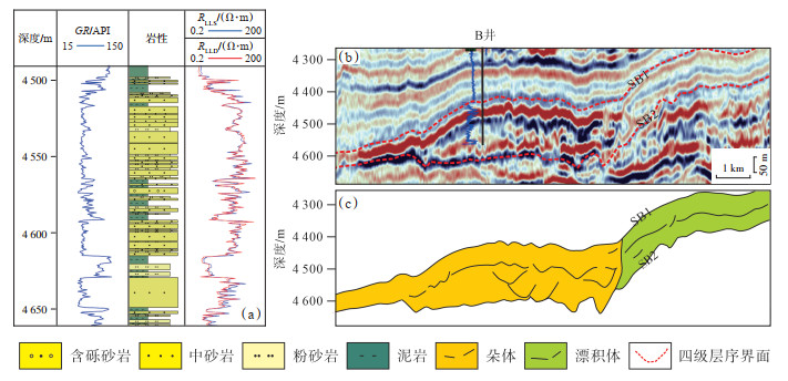 朵体/朵体复合体顶面在地震剖面上表现为连续强反射地震同相轴,内部连续性较差,地震属性分析可看出其平面分布呈朵叶状或近朵叶状[15, 22]。朵体/朵体复合体砂岩主要由多期叠置中—粗粒无构造块状砂岩组成,测井响应特征为箱形-微漏斗形,厚度为40~150 m(图 3)。