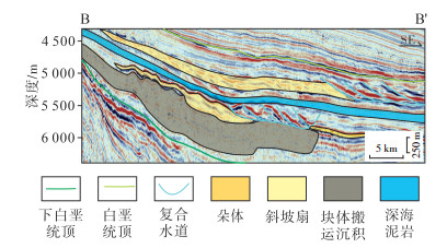 块体搬运沉积在地震剖面上表现为明显异于围岩的地震反射特征,内部主要为中等—弱振幅杂乱反射或空白反射特征,可见挤压褶皱变形,与下伏地层呈侵蚀不整合接触[15, 22],主要为混杂泥质沉积。
