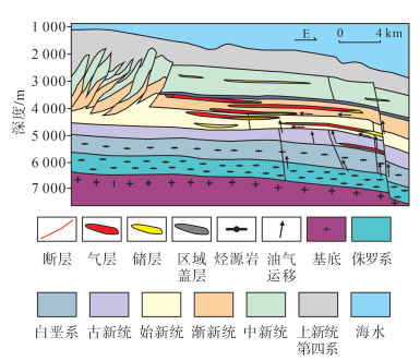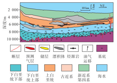下载原图 图 5 赞比西坳陷深度域二维地震剖面及解释方案(剖面位置见图 1a) Fig. 5 Depth domain seismic section and stratigraphic interpretation in Zambezi Depression |