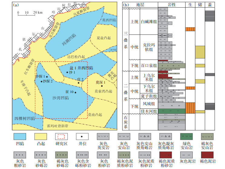 1 地质概况沙湾凹陷是准噶尔盆地主要的富烃凹陷之一[20],位于盆地中央坳陷西北部(图 1a)。沙湾凹陷具备有利的生油条件,纵向上在多个层系均有油气发现,拥有多期油气成藏的特点[21]。凹陷西斜坡具备有利的运移和封闭条件,处于油气成藏的有利构造位置,且已经取得了勘探突破[22]。尽管沙湾凹陷深凹带油气生成条件优越,但是由于埋深较大,二叠系埋深大于6 000 m,地震资料和钻井钻遇较少,因此对凹陷中心深层—超深层油气地质研究较为薄弱。