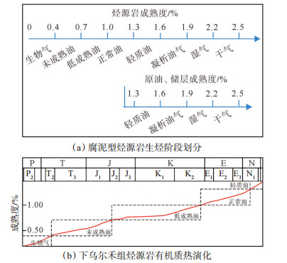 下载原图 图 2 烃源岩热演化阶段及生烃产物类型 Fig. 2 Thermal evolution stage of source rocks and types of hydrocarbon generation products |
