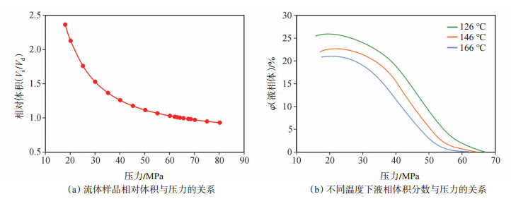 通过对配制的地层流体开展恒质膨胀实验(P-V关系测试),可以获得地层流体的露点压力、不同压力下流体的相对体积以及饱和压力下含液体积分数等参数[27]。地层流体的相对体积(实验压力下体积与露点压力下体积之比)为0.929~2.372,随着压力降低,相对体积逐渐增大(图 3a)。在地层温度(166 ℃)下测得的征10井上乌尔禾组流体的露点压力为64.69 MPa。实验温度从166 ℃降至126 ℃,露点压力从64.69 MPa增至66.16 MPa(图 3b),反映出随温度降低流体更易凝析。不同实验温度下,地层流体相对体积随着压力的不断降低表现出先快速增大,达到最大含液量后又开始减小的趋势(图 3b)。