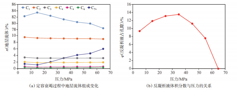 在地层温度下开展定容衰竭实验可以模拟衰竭式开发过程中地层流体的组分及反凝析液量等物性参数的变化[28]。征10井地层流体样品中,C1—C6含量均表现出随着实验压力的降低而呈上升的趋势(图 4)。其中,C1的摩尔分数由78.452% 增至82.264%,而C7+的摩尔分数由最初的5.994% 下降到1.442%,可见定容衰竭过程中地层流体组成会逐渐变轻。定容衰竭过程中实验压力达到露点压力(64.69 MPa)时,反凝析液开始出现。反凝析液量随实验压力降低表现出先快速增大,后减小的趋势(图 4)。反凝析液体积分数最大为13.53%,此时对应的压力为34.78 MPa,当实验压力降至0时,反凝析液体积分数约为8.00%。