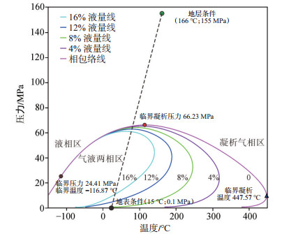 根据地层流体高温高压物性测试结果,利用PVTsim软件拟合得到征10井上乌尔禾组地层流体的相图(图 5)。地层流体样品临界温度为-116.87 ℃,临界凝析温度为447.54 ℃,临界压力为24.41 MPa,临界凝析压力为66.23 MPa,模拟结果与定容衰竭实验结果较为接近。地层温度和压力是影响油气藏流体相态的2个重要外在因素[32]。征10井地层温度为166.0 ℃,介于临界温度和临界凝析温度之间,地层压力为155 MPa,地层温度下露点压力为64.69 MPa,地层压力远高于露点压力,地露压差高达90.31 MPa,表明地层条件下流体呈凝析气相特征(图 5)。