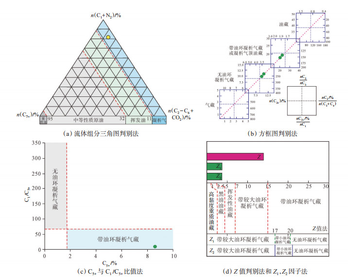 根据井流物组分,以C1+N2,C2—C6+CO2和C7+含量为端元绘制组分三角图,分别以摩尔分数为11%,32% 和95% 的C7+为界限划分为不同的油藏类型[34]。征10井井流物中C7+摩尔分数为6.801%,在三角相图中落在凝析气藏区(图 6a)。计算征10井地层流体的C2+,C2/C3,100×C2/(C3+C4)与100×C2+/C1,并投到方框图中。结果显示,特征参数集中分布在无油环凝析气藏或带油环凝析气藏区域中,表明征10井油藏类型主要为带油环凝析气藏(图 6b)。利用C1—C5+组分含量之间的相互关系能够判断凝析气藏是否带油环,C5+摩尔分数大于1.75% 且C1/C5+小于52,为带油环的凝析气藏[35]。征10井流体组成中C5+摩尔分数为8.61%,C1/C5+为9.37,为带油环凝析气藏(图 6c)。根据C1—C5+计算组合参数Z,Z1与Z2可进一步揭示油环的规模[34]。利用征10井流体组成计算的Z值为7,Z1值为6.8,Z2值为6.7,指示征10井上乌尔禾组油藏类型为带大油环凝析气藏(图 6d)。