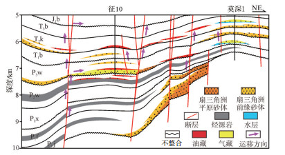 走滑断层作为油气垂向运移通道,使得二叠系烃源岩形成的油气可以沿着油源断层向上运移至三叠系乃至侏罗系聚集成藏。与上乌尔禾组凝析气藏油气同产不同的是,征10井三叠系克拉玛依组试油出油,推测发育为油藏(图 7)。造成油气相态差异的原因一方面是油气垂向运移距离远,轻质组分损失多,积累了更多的中质—重质组分;另一方面,与晚期油气输导条件有关,如果晚期形成的湿气能够沿输导断层运移进入古油藏,则会导致其形成凝析气藏。在储层物性差、断层不发育的地区,缺乏晚期湿气充注,则油藏相态不会发生变化。然而,目前缺少三叠系原油样品高温高压物性分析结果,因此流体组成、相态类型及形成机制的准确分析有待进一步深入研究。