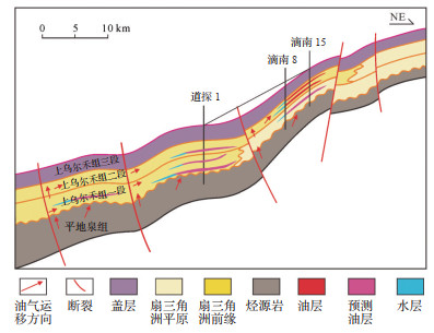 1 地质概况东道海子凹陷北部的滴水泉南断裂紧邻滴南凸起,南部白家海断裂与白家海凸起相接,西部与莫索湾凸起相邻,呈近北东—南西向的狭长条带状展布,北东向收缩为喇叭口状与五彩湾凹陷相连(图 1),凹陷中心靠近南东,向北过渡到滴西鼻状隆起带。凹陷内二叠系上乌尔禾组发育滴南、莫东两大扇三角洲沉积体系,物源方向为东北向[8-9],前缘有利相带分布广,受滴南凸起与白家海凸起夹持。凹陷东北部形成了大范围的凹槽,受斜坡掀斜影响,凹槽内部又形成了二级坡折—三级平台的古地貌样式[10]。东道海子凹陷二叠系上乌尔禾组是该区主要的勘探层系,烃源岩为二叠系平地泉组和石炭系,但目前无井钻揭石炭系。上乌尔禾组沉积时期,研究区湖平面不断上升,在古地貌与湖平面的共同作用下形成“沟槽控砂、平台控扇”的退覆式沉积模式[11-12],即坡下平台发育早期扇体、坡上平台发育晚期扇体。滴南地区上乌尔禾组处于第一台阶,发育扇三角洲平原亚相和扇三角洲前缘亚相;道探1井区处于第二台阶,发育扇三角洲前缘亚相,储层物性好,为有利沉积相带。