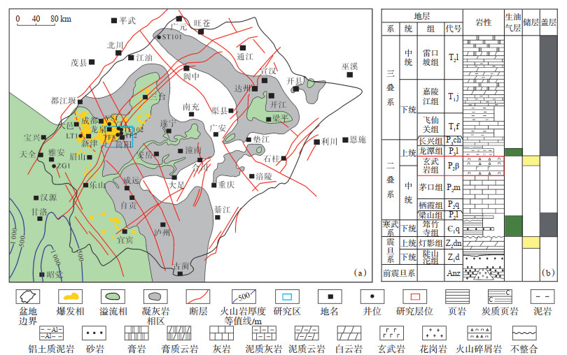下载原图 图 1 四川盆地简阳地区二叠系火山岩相分布[22](a)和岩性地层综合柱状图(b) Fig. 1 Distribution of Permian volcanic facies (a) and stratigraphic column (b) of Jianyang area, Sichuan Basin |
