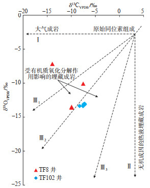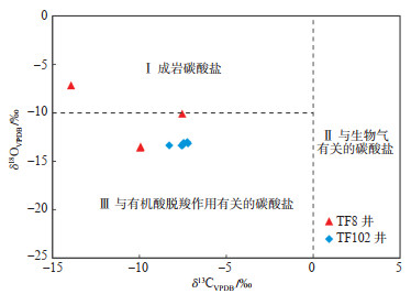 选取TF8井、TF102井发育方解石脉的10个火山碎屑岩样品进行碳氧同位素测试,结果显示δ13CVPDB值为-13.94‰~-7.21‰,平均为-8.67‰;δ18OVPDB值为-13.59‰~-7.16‰,平均为-12.37‰。碳酸盐胶结物中有机质来源δ13C(-8‰~-23‰)偏负值,无机来源δ13C则偏正值[31-32],研究区样品的δ13CVPDB偏负值,指示其碳源以有机成因为主。Keith等[33]曾提出区分海相灰岩与淡水灰岩的经验公式:
