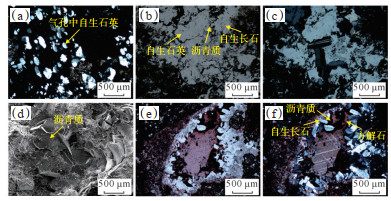 下载原图 图 11 四川盆地简阳地区二叠系火山碎屑岩储层典型成岩事件 (a)石英充填气孔,TF8井,5 140.42 m,正交偏光;(b)—(c)TF102井,5 465.69 m,同一视域单偏光与正交偏光;(d)沥青质,TF102井,5 450.02 m,扫描电镜照片;(e)—(f)TF8井,5 156 m,方解石充填溶蚀孔,同一视域单偏光与正交偏光。 Fig. 11 Typical diagenetic events of Permian pyroclastic reservoirs in Jianyang area, Sichuan Basin |