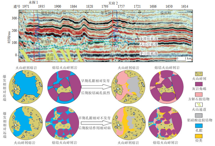 5 油气地质意义四川盆地简阳地区二叠系火山碎屑岩储层发育受表生成岩阶段次生孔隙发育程度的控制,后期埋藏成岩阶段大量碳酸盐矿物胶结充填不利于孔隙的保存。碳酸盐胶结物的发育与储层中灰岩碎屑发育和深部热液作用密切相关,这些热液和灰岩碎屑的发育受火山通道和爆发相的共同控制(图 12),一方面火山通道和裂缝为有机酸与油气运移提供条件,改善储集层物性,有利于油气赋存;另一方面,深部热液流体沿着裂缝运移发生充填胶结作用,对储层形成不利。因而,位于火山通道附近相对厚层的火山碎屑岩反而不利于储层的发育[45],相对远离火山通道的熔结火山碎屑岩,受到表生溶蚀,次生孔隙发育,且受后期碳酸盐胶结作用影响较小,是研究区下一步重点勘探的有利目标区。