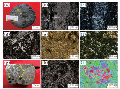Bas.玄武岩角砾,Lm.灰岩角砾,Mf.浆屑,Chl.绿泥石,Cal.方解石,Alb.钠长石,Ap.磷灰石,AQ.自生石英。 (a)火山角砾熔岩,灰绿色玄武岩岩屑,熔浆胶结,YT1井,5 645.98~5 646.24 m,岩心;(b)—(c)凝灰质火山角砾熔岩,凝灰质岩屑,YT1井,5 647.11 m,同一视域下单偏光与正交偏光;(d)凝灰熔岩,多孔熔岩岩屑,熔浆胶结,YT1井,5 646.01 m,单偏光;(e)—(f)凝灰质火山角砾熔岩,玻屑绿泥石化,YT1井,5 649.50 m,同一视域下单偏光与正交偏光;(g)熔结火山碎屑岩,灰岩角砾,浆屑具塑性流动特征,气孔呈“串珠状”分布,红色箭头表示气孔被绿泥石或硅质充填,TF2井,5 264.26~5 264.35 m,岩心;(h)熔结火山角砾岩,生物碎屑,TF2井,5 265.49 m,单偏光;(i)熔结火山角砾岩,绿泥石化,TF2井,5 263.58 m,QEMSCAN扫描。 Fig. 2 Petrological characteristics of Permian pyroclastic reservoirs in Jianyang area, Sichuan Basin |