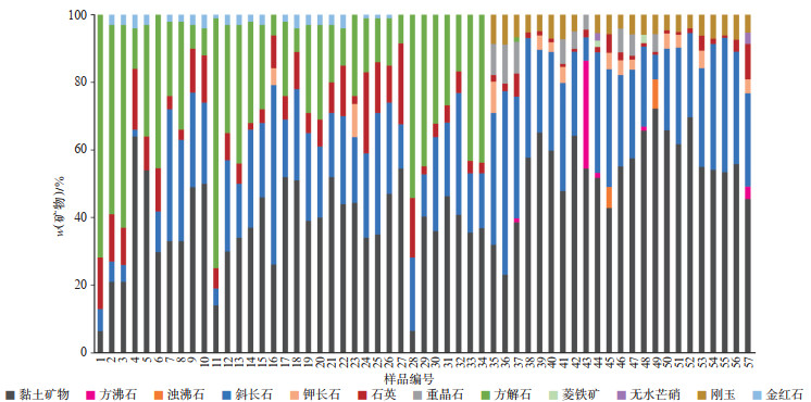 下载原图 图 3 四川盆地简阳地区二叠系火山碎屑岩储层全岩矿物组成 注:样品1—27:TF8井,5 136.87~5 160.40 m,碎屑熔岩;样品28—34:TF2井,5 250.03~5 265.63 m,熔结火山碎屑岩;样品35—57:YT1井,5 645.79~5 650.89 m,碎屑熔岩。 Fig. 3 Whole rock mineral composition of Permian pyroclastic reservoirs in Jianyang area, Sichuan Basin |