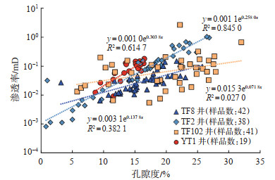 研究区4口钻井140个样品的孔渗数据显示(图 4),孔隙度分布范围广,为0.78%~32.00%,平均为16.67%,渗透率为0.001~2.680 mD,平均为0.125 mD。根据《火山岩储集层描述方法》[23],总体属于高孔、低渗储层。火山碎屑熔岩孔隙度为3.17%~32.00%,平均为17.25%,集中分布在15%~20%;渗透率为0.005~2.680 mD,平均为0.100 mD,集中分布在0.01~0.10 mD。熔结火山碎屑岩孔隙度为0.78~26.87%,平均为15.12%,集中分布在15%~20%;渗透率为0.001~1.040 mD,平均为0.198 mD,集中分布在0.10~1.00 mD。整体上研究区孔隙度与渗透率呈正相关性,其中TF2井熔结火山碎屑岩物性较优。