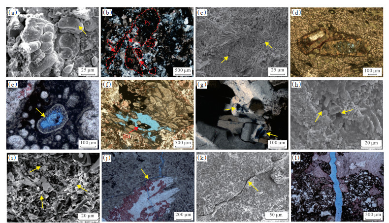 裂缝包括构造缝和溶蚀缝。镜下观察发现构造缝多为平直状,延伸较远,可切穿碎屑颗粒和早期胶结物(图 5j,5k)。溶蚀缝多由构造裂缝经酸性流体溶蚀而形成[26],缝隙较宽(图 5l),约0.3 mm,连通性好,为成岩流体活动创造了条件。