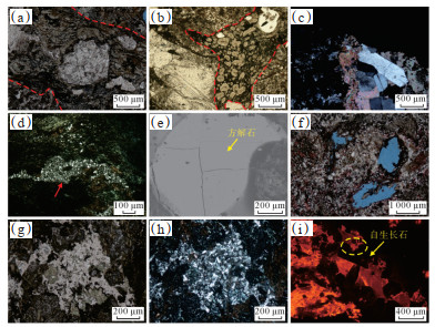(6)交代作用。研究区主要的交代作用包括绿泥石对岩屑、玻屑与自生长石的交代(参见图 2e,图 6g,6h),碳酸盐矿物对浆屑、自生长石与自生石英的交代(图 6f,6c)。本区火山碎屑物来源于基性岩浆,富含高铁镁质矿物,稳定性差,极易发生绿泥石交代蚀变作用。
