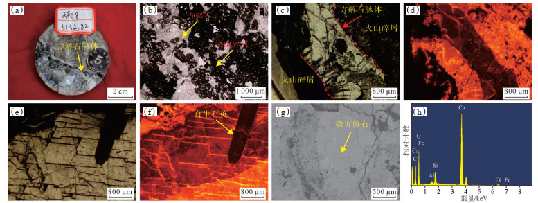 下载原图 图 7 四川盆地简阳地区二叠系火山碎屑岩储层方解石胶结物特征 (a)溶洞充填方解石脉,具2组解理,TF8井,5 152.82 m,岩心;(b)方解石胶结,TF8井,5 136.87 m,单偏光;(c)—(d)方解石脉体由边缘向内依次发橙黄色、暗红色光,TF8井,5 152.82 m,分别为同一视域下单偏光与阴极发光;(e)—(f)方解石脉与硅质胶结物伴生,硅质不发光,TF8井,5 168.80 m,分别为同一视域下单偏光与阴极发光;(g)—(h)分别为铁方解石背散射图像及能谱特征,TF8井,5 168.80 m。 Fig. 7 Characteristics of calcite cements of Permian pyroclastic reservoirs in Jianyang area, Sichuan Basin |