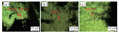 下载原图 图 8 四川盆地简阳地区二叠系火山碎屑岩储层方解石胶结物包裹体镜下特征 (a)盐水包裹体,成群分布,TF102井,5 460.57 m;(b)盐水包裹体,沿解理缝分布,TF8井,5 152.82 m;(c)盐水包裹体,呈“串珠状”,TF8井,5 166.74 m。 Fig. 8 Microscopic characteristics of calcite cement inclusions of Permian pyroclastic reservoirs in Jianyang area, Sichuan Basin |