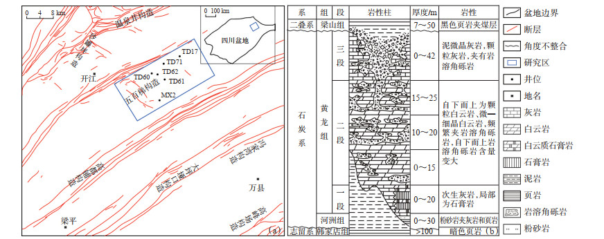 1 地质概况川东地区位于四川盆地东部,北部以米仓山—大巴山为界,南西部紧邻华南板块,由一系列北北东向的高陡背斜构造带组成(图 1)。石炭纪早—中期该区域沉积了一套黄龙组碳酸盐岩,分布于巫山、石柱、彭水、垫江及华蓥山中段,厚度为2~82 m,多不整合于中志留统韩家店组泥页岩上,仅在东部沉积地势较高部位整合于下石炭统河洲组滨海相、浅海相碎屑岩之上[27]。石炭纪中—晚期,川东地区受云南运动影响,整体抬升,于黄龙组广泛发育顶部风化壳及层内古岩溶体系[28]。黄龙组自下而上可分为黄一段、黄二段和黄三段,黄一段为一套萨勃哈相沉积,岩性主要为次生灰岩、次生灰质岩溶角砾岩和膏岩,底部富含陆源碎屑;黄二段为有障壁海岸相沉积,岩性主要为颗粒白云岩、微—细晶白云岩,频繁夹有白云质岩溶角砾岩;黄三段为一套海湾陆棚相沉积,岩性主要为泥微晶灰岩和颗粒灰岩。古岩溶作用导致黄二段、黄三段多受剥蚀,并在黄龙组内部也形成了勘探潜力巨大的岩溶储层,后被下二叠统梁山组煤系地层超覆[23]。