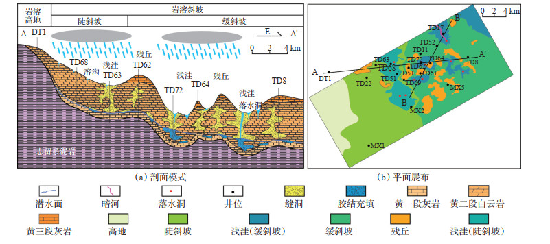 3 岩溶古地貌识别 3.1 地震识别特征五百梯地区整体上位于岩溶斜坡带,西部与岩溶高地接壤,向东逐渐过渡为岩溶盆地[23]。现代岩溶地貌研究常将溶蚀负地貌(洼地)作为岩溶的标志性地貌[11, 30-31],基于此,本文将二级地貌单元岩溶斜坡划分负地貌(浅洼)和地势相对较高的正地貌(残丘)2种三级地貌单元,其中残丘指的是遭受岩溶侵蚀后所残留的碳酸盐岩山丘,与“Residual Hills”的概念[32]类似。此外,在浅洼中注重识别除溶洞之外具有较强水文地质意义的落水洞和暗河。该划分方案与张亚等[17]、刘曦翔等[21]关于古岩溶斜坡内部存有高低差异区的认识相符合。