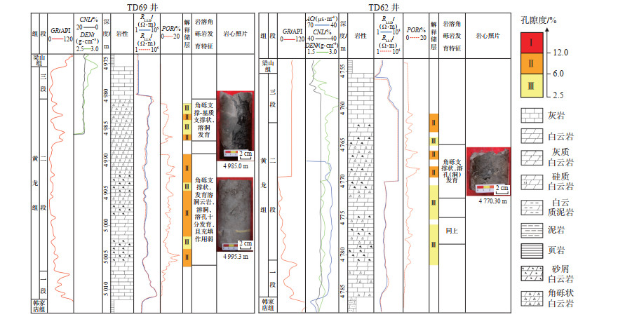 对研究区五十余口钻井的岩心和薄片进行观察,黄龙组广泛发育溶洞及裂缝,巨量岩溶洞穴和裂缝中主要充填岩溶角砾,此外,还可见化学沉淀充填物以及上覆梁山组的细粒沉积物(图 6a,6b)。其中淡水方解石和淡水白云石是古岩溶作用常见的标志矿物[24],表明黄龙组在石炭纪晚期经历了广泛而强烈的岩溶作用。