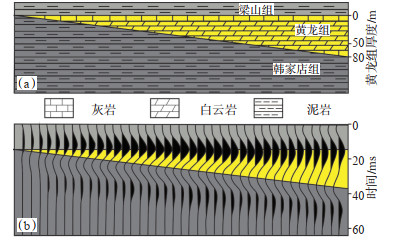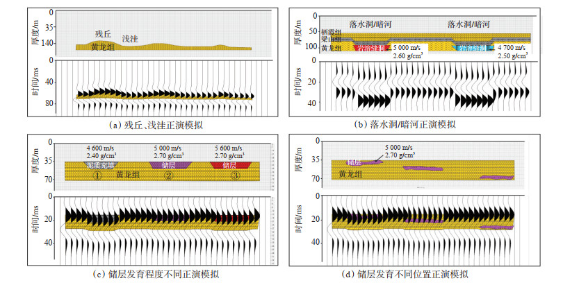 (2) 分别模拟残丘、浅洼、落水洞、暗河的地震响应特征。残丘残余地层厚度较大,古地貌位置相对较高,而浅洼受剥蚀较严重,残余地层厚度较小,古地貌位置相对较低(图 5a);落水洞与暗河受溶蚀塌陷影响,在剖面上表现为相对两侧地层的落差较大。模拟在层内发育2种不同程度岩溶缝洞的情况,第一类岩溶缝洞发育较好时,黄龙组泥岩速度取5 000 m/s、密度取2.60 g/cm3,第二类岩溶缝洞发育较差时,黄龙组泥岩速度为4 700 m/s、密度为2.50 g/cm3(图 5b)。