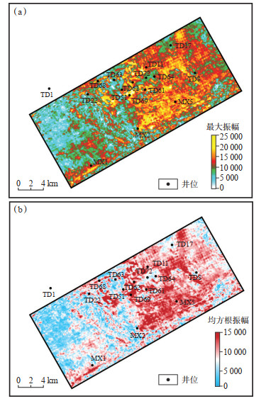 下载原图 图 3 川东五百梯地区石炭系顶地震最大振幅(a)及均方根振幅(b) Fig. 3 The maximum amplitude(a)and root mean square amplitude(b)of Carboniferous top in Wubaiti area, eastern Sichuan Basin |