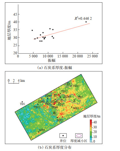 将研究区石炭系地震振幅数据与钻井资料进行对比(图 4a),地层发育厚度与振幅值呈较好的正相关关系,相关系数R2约为0.45,数据较可靠。以石炭系顶向下开时窗,求取时窗内波峰最大振幅值,根据振幅与厚度的关系建立拟合公式,进而可实现以振幅求取地层厚度。以该方法预测的石炭系残余厚度结果(图 4b)显示,地层厚度为0~45 m,西北部厚度较小,为0~15 m;向东南方向厚度逐渐变大,主要为10~30 m,这说明石炭系遭受岩溶作用的强度由西向东逐渐变小,这与石炭纪晚期开江—梁平古隆起造成的“西高东低”古地理环境相吻合。