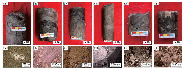下载原图 图 6 川东五百梯地区石炭系黄龙组岩溶角砾岩主要类型及镜下特征 (a)溶洞中充填自生石英,MX2井,5 043.80 m;(b)泥质条带充填,TD61井,4 999.20 m;(c)网缝镶嵌状灰质岩溶角砾岩,TD61井,5 023.20 m;(d)基质支撑状白云质岩溶角砾岩,TD61井,5 011.50 m;(e)角砾支撑基质填隙状白云质岩溶角砾岩,TD62井,4 770.33 m;(f)角砾支撑亮晶胶结灰质岩溶角砾岩,TD62井,4 783.61 m;(g)残余砂屑微—粉晶白云岩,可见溶蚀孔,周围充填淡水白云岩(-),YA9井,5 427.40 m;(h)溶蚀洞(6 mm×4 mm)充填淡水方解石(-),YA9井,5 430.00 m;(i)网缝镶嵌状白云质岩溶角砾岩(-),TD60井,4 724.03 m;(j)基质支撑状云质岩溶角砾岩(+),TD71井,4 491.38 m;(k)角砾支撑基质填隙状白云质岩溶角砾岩(-),TD17井,4 793.04 m;(l)角砾支撑亮晶胶结云质岩溶角砾岩(-),角砾成分多样、大小不一,TD17井,4 776.36 m。 Fig. 6 Main types and microscopic characteristics of karst breccia of Carboniferous Huanglong Formation in Wubaiti area, eastern Sichuan Basin |
