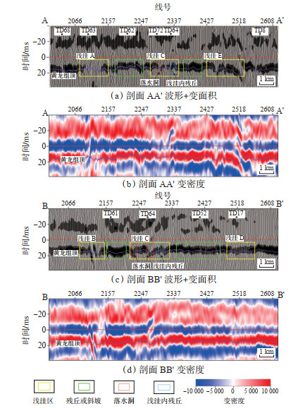整体而言,地貌起伏对应于反射同相轴的上提、下拉特征,正地形显示为上提特征,负地形显示为下拉特征;当地层厚度小于50 m时,厚度主要影响振幅大小,厚度越大,振幅值就越大。因此,可以依据理论反射特征和在地震振幅剖面上的展布特征,对残丘、浅洼、落水洞等地貌单元进行识别(表 1)。