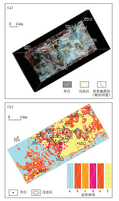 下载原图 图 8 川东五百梯地区石炭系RGB分频融合(a)及波形聚类图(b) Fig. 8 RGB frequency division fusion(a)and waveform clustering diagram(b)of Carboniferous in Wubaiti area, eastern Sichuan Basin |