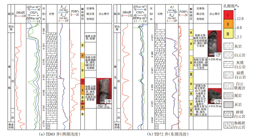 4.1 浅洼差异溶蚀特征显示斜坡分带性如前文所述,东部浅洼与西部浅洼在地震剖面上存在明显差异,再结合岩心观察发现二者虽然黄龙组发育厚度相近,但存在着不同的岩溶特征。西部浅洼中岩溶孔洞和裂缝更发育,显示出较强的垂向溶蚀特征,多通体发育;东部浅洼中岩溶孔洞多发育于黄龙组上部,且发育程度较低,黄龙组中下部岩溶孔洞不发育,有效裂缝多被灰质、白云质和泥质充填。以西部浅洼TD63井和东部浅洼TD72井为例进行对比(图 9),这2口井黄龙组颗粒滩沉积、岩溶角砾岩的发育程度均相似,岩溶角砾岩均通体发育,TD63井黄龙组中下部(4 555.2~4 567.1 m) 可见溶洞603个(溶洞数量参考收集项目资料及完井报告,由于缺乏该井岩心照片,故用相邻井TD51井中下部岩心照片供参考),而TD72井黄龙组溶洞、溶孔发育程度更低,黄龙组中下部(4 846.5~4 861.0 m)岩心中仅见小溶洞4个,且岩溶角砾岩富含泥质基质。这表明TD72井在区域内最后一次岩溶旋回中整体处于胶结作用较强的静滞潜流带,与浅洼地势较低的特征相吻合,而TD63井所处的浅洼由于地势较高,泄水能力较强,多发生溶蚀而非胶结充填。