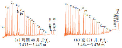 下载原图 图 5 玛湖凹陷西南地区2口典型井二叠系凝析油饱和烃气相色谱 Fig. 5 Gas chromatograms of saturated hydrocarbon of Permian condensate oil from two typical wells in southwest of Mahu Sag |