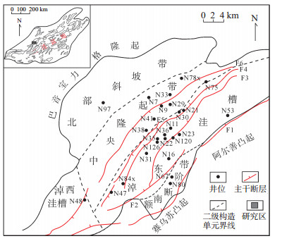 下载eps/tif图 图 1 二连盆地额仁淖尔凹陷区域地质图 Fig. 1 The regional geology of Erennao'er Sag in Erlian Basin F1.赛乌苏断层;F2.额南断层;F3.包尔断层;F4.吉格森断层;F5.巴润断层;F6.亚布根断层 |
